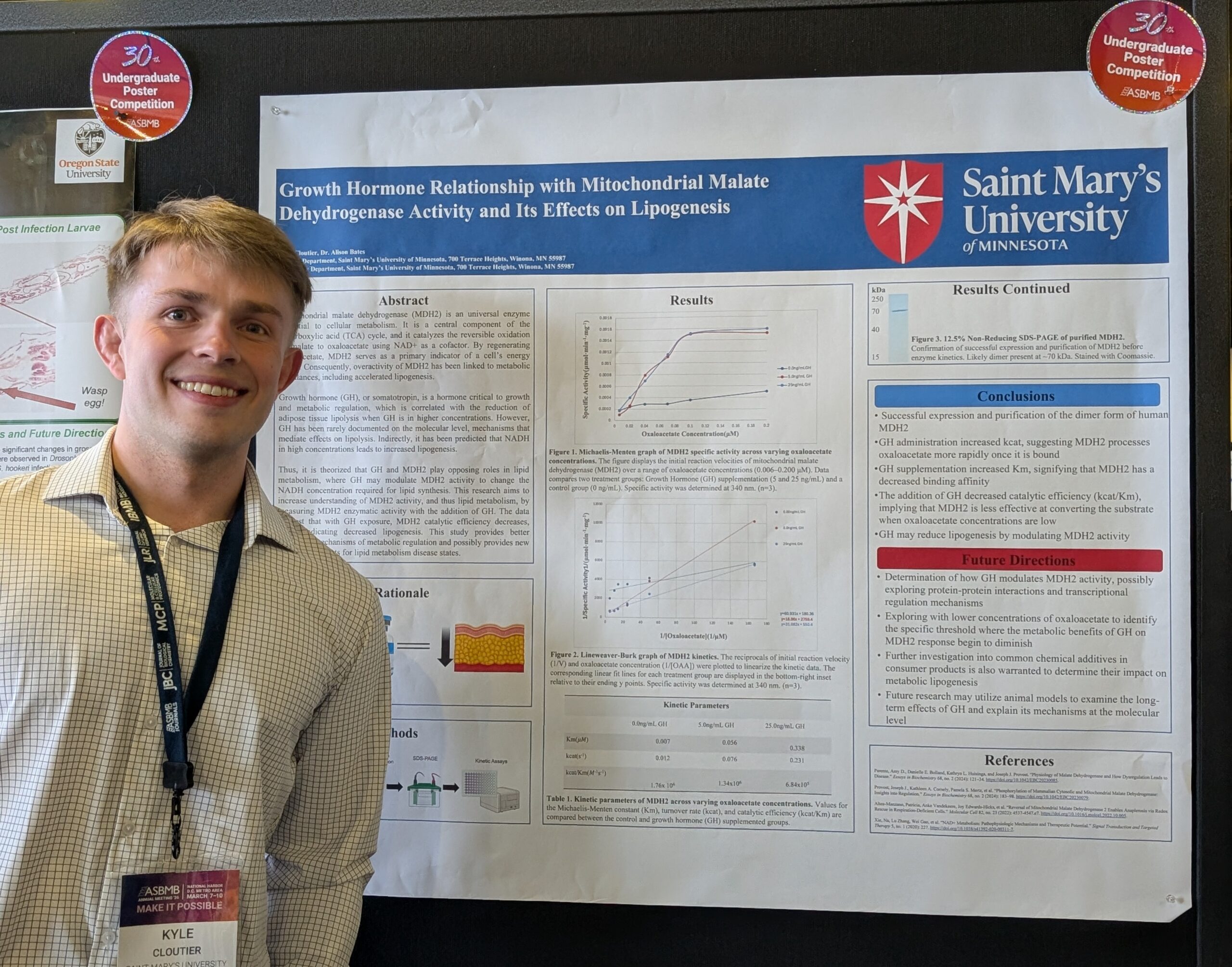 Undergraduate biochemistry student Kyle Cloutier presented his research on malate dehydrogenase activity, conducted with Dr. Alison Bates, at the annual Biochemistry and Molecular Biology national conference.