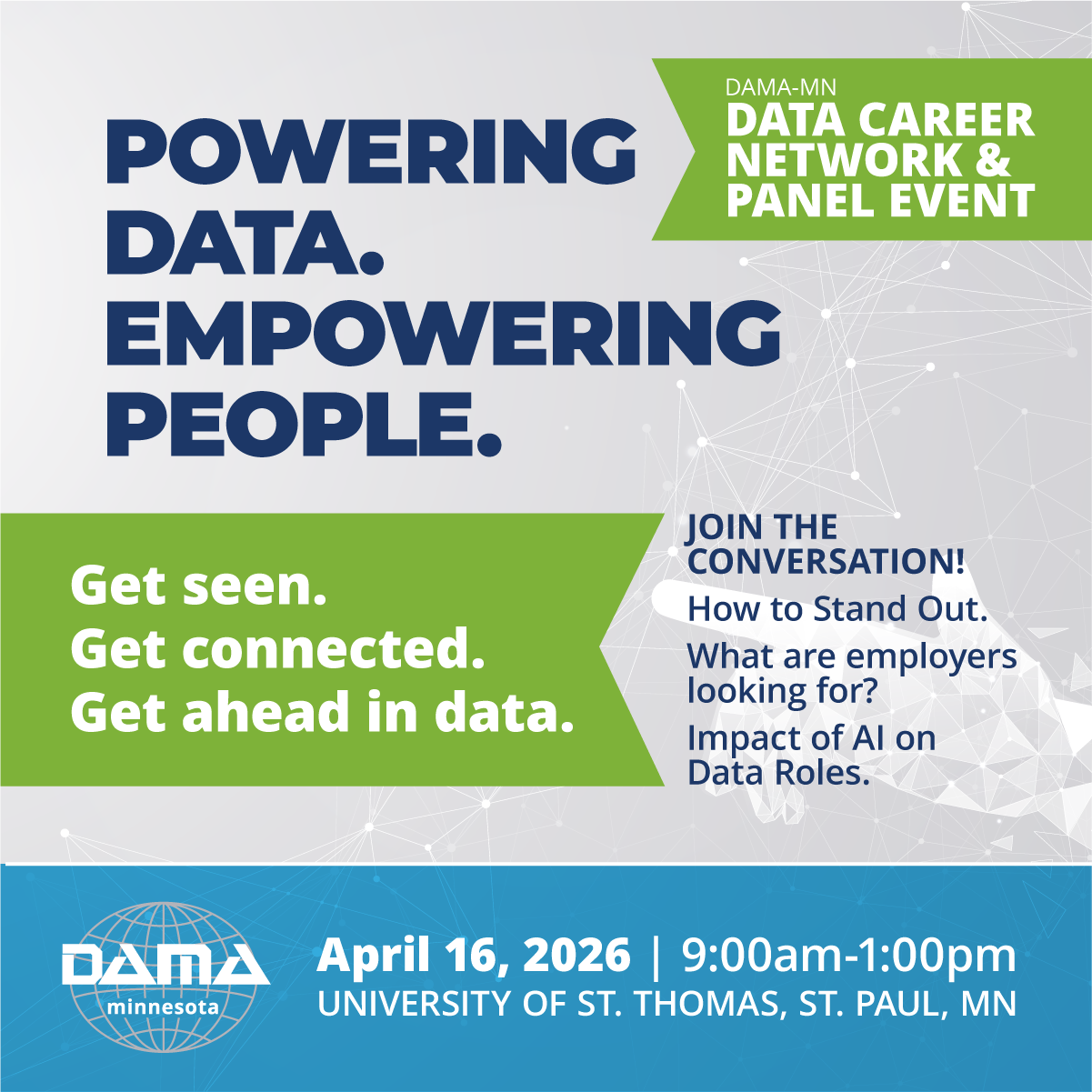 DAMA-MN, a non-profit professional data organization, partnered with the University of St. Thomas, University of MN – Carlson School of Management, and other Minnesota colleges and universities to bring you an opportunity to connect with data organizations and professionals on April 16, 2026, at the University of St. Thomas, St. Paul, MN campus. All Minnesota students pursuing a data-related degree are welcome to attend (analytics, data science, MIS, etc.)!