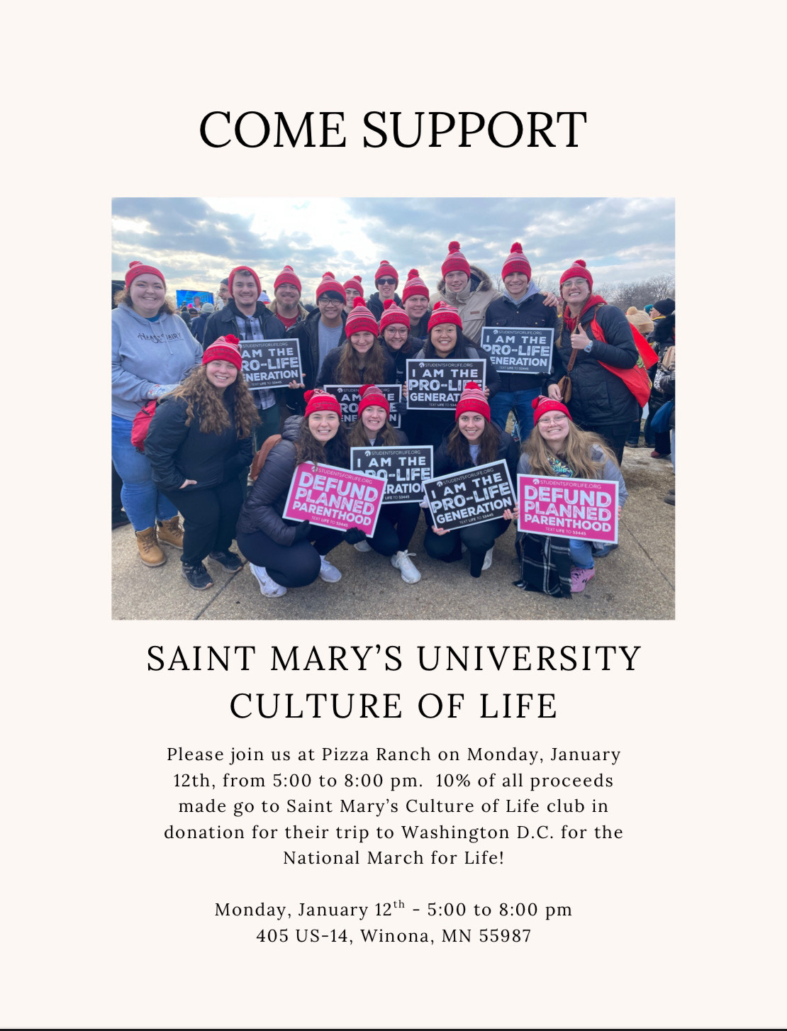 Culture of Life is having a fundraiser at Pizza Ranch on Monday, January 12 from 5pm-8pm for their upcoming trip to Washington D.C. for the March for Life. Please come out and support us, we would love to see you there!