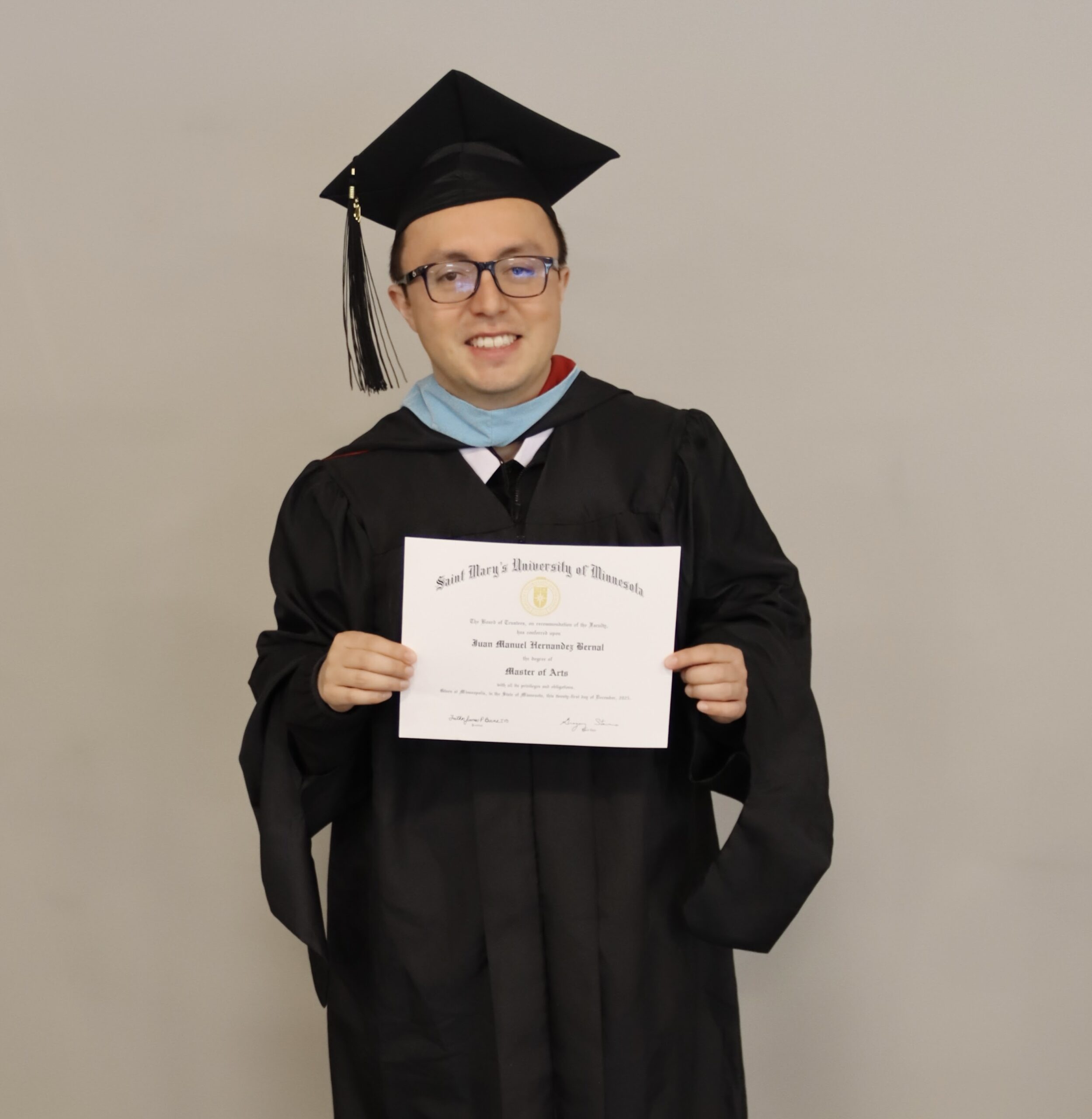 In January of 2023, Brother Juan Manuel came from Colombia to Saint Mary’s University to pursue a masters degree and to be a member of the Vocation Ministry Team for the Midwest District. In these three and a half years, Bro. Juan has shared an office in Campus Ministry with Brother Larry and has been very involved on campus. He currently leads music at the Spanish mass every Sunday at noon at St. Thomas More Chapel and also serves as a team leader for Fe y Vida, a national Lasallian ministry for Hispanic Catholics. In January, Brother JM graduated from SMU and received his Masters in Educational Leadership. In late June he will return to his home District of Bogota, where he will begin his new assignment at a Lasallian school in Villavicencio, Colombia.