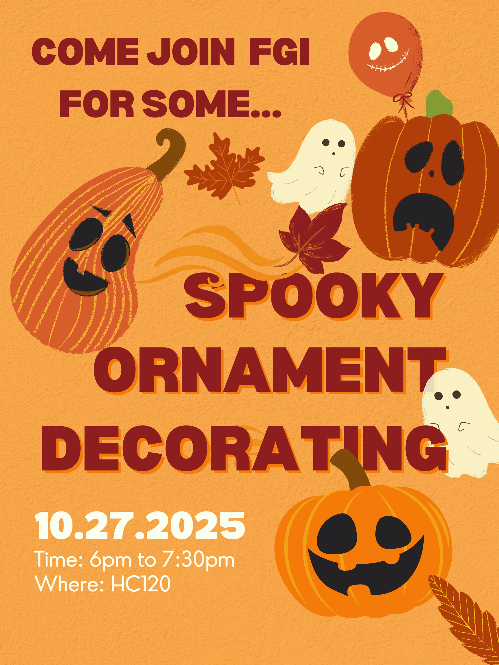 The FGI Social Committee is brewing up some spooky fun! Join us in HC120 on Monday, October 27, from 6–7:30 p.m. for a night of creativity, laughs, and a haunted film…