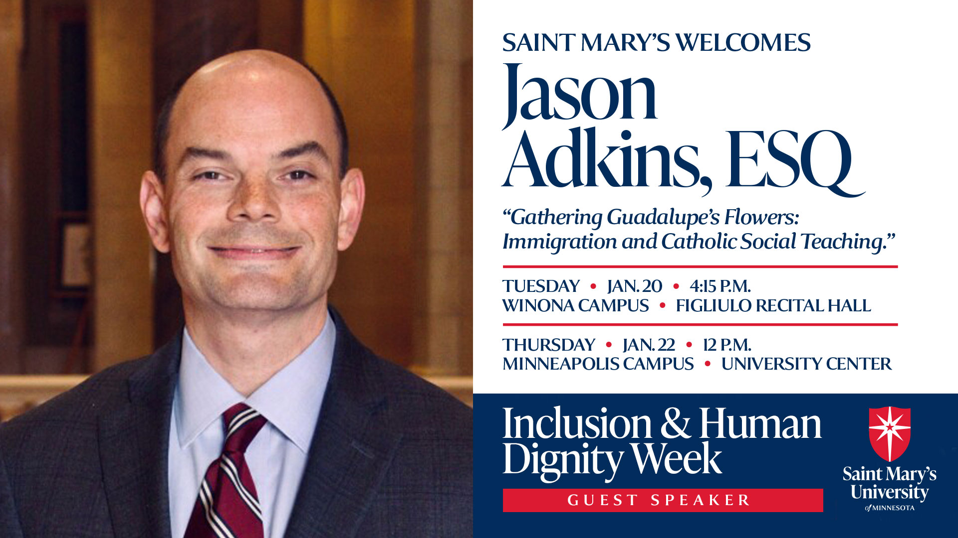 I am pleased to announce that for this year’s Inclusion and Human Dignity Week, we will have Jason Adkins as our speaker. The title of his talk is “Gathering Guadalupe’s Flowers: Immigration and Catholic Social Thought.” He will be speaking on the Winona campus on January 20th at 4:15pm in the Figliulo Theater and on the Minneapolis campus on January 22nd at 12pm in the University Center.