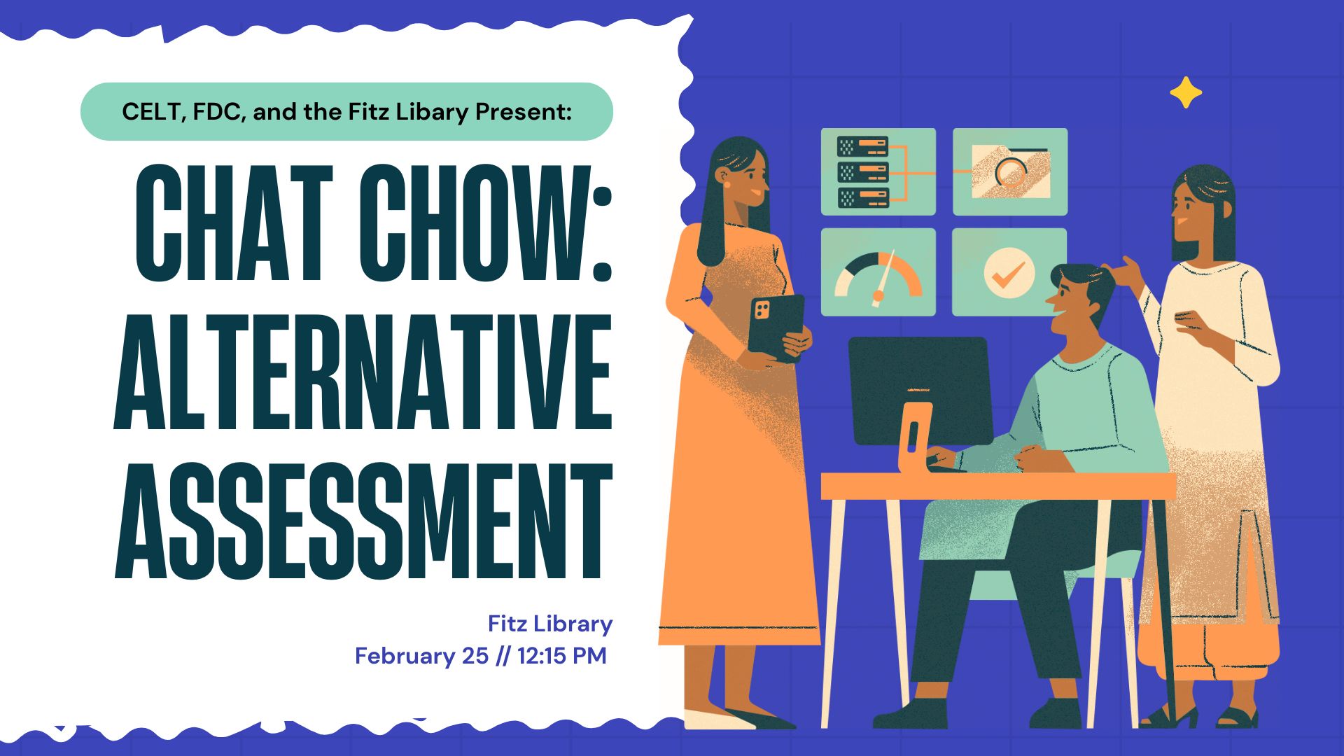The Fitz Library is hosting another session of the Chat + Chow professional development series today! Join four members of the faculty, Jill Kaiser, Miranda Greenwold, Tim Indahl, and Robyn Wangberg for an exploration of alternative learning assessments. Please join us in the Fitz Library for lunch and engaging conversations!