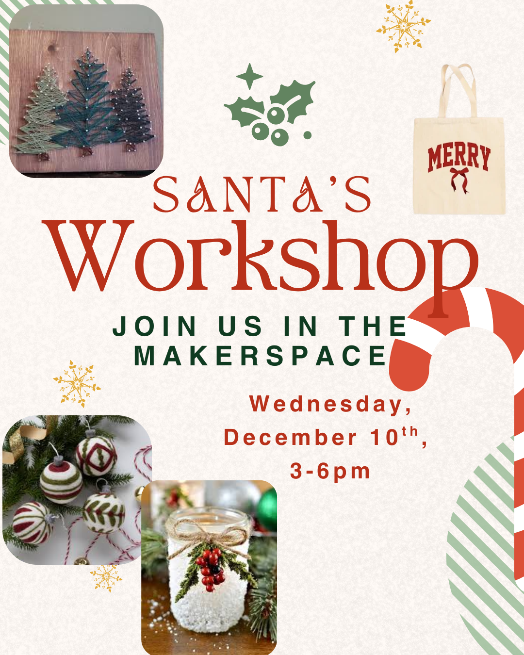 This holiday season, the makerspace invites all students, staff, and faculty to join us for Santa’s Workshop, a creative session where you can make personalized Christmas gifts for friends and family—or a unique item just for yourself! The workshop will be held in The Makerspace on Wednesday, December 10th, from 3:00 PM to 6:00 PM. Come as you can, and stop by the different stations to make your gifts! Participants will have access to all the materials and guidance needed to create a variety of festive items, with project options ranging from elegant snowy candle holders and beautiful string art trees, to cozy felted ornaments, fun slime making, and more. Come spend a relaxing afternoon with us to unleash your creativity and make some handmade holiday magic!