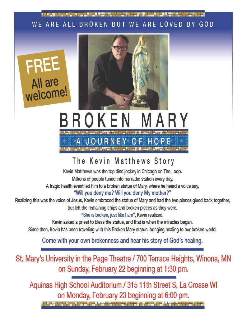 On Sunday, February 22nd at 1:30 pm, Kevin Matthews will be sharing his conversion story in the Page Theater. Please come and listen to this inspiring story of brokenness, mercy, healing, and hope!