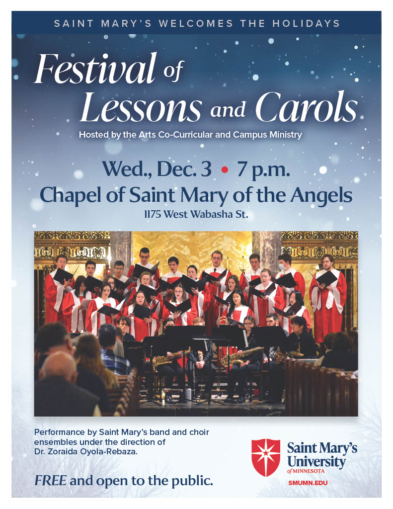 Heralding the Advent season, the Saint Mary’s University Concert Choir and Band invite you and your loved ones to the beautiful Chapel of Saint Mary of the Angels (1175 West Wabasha Street) for Lessons and Carols — a free, family-friendly program reflecting on the Christmas story through several short readings, hymns, and Christmas carols.