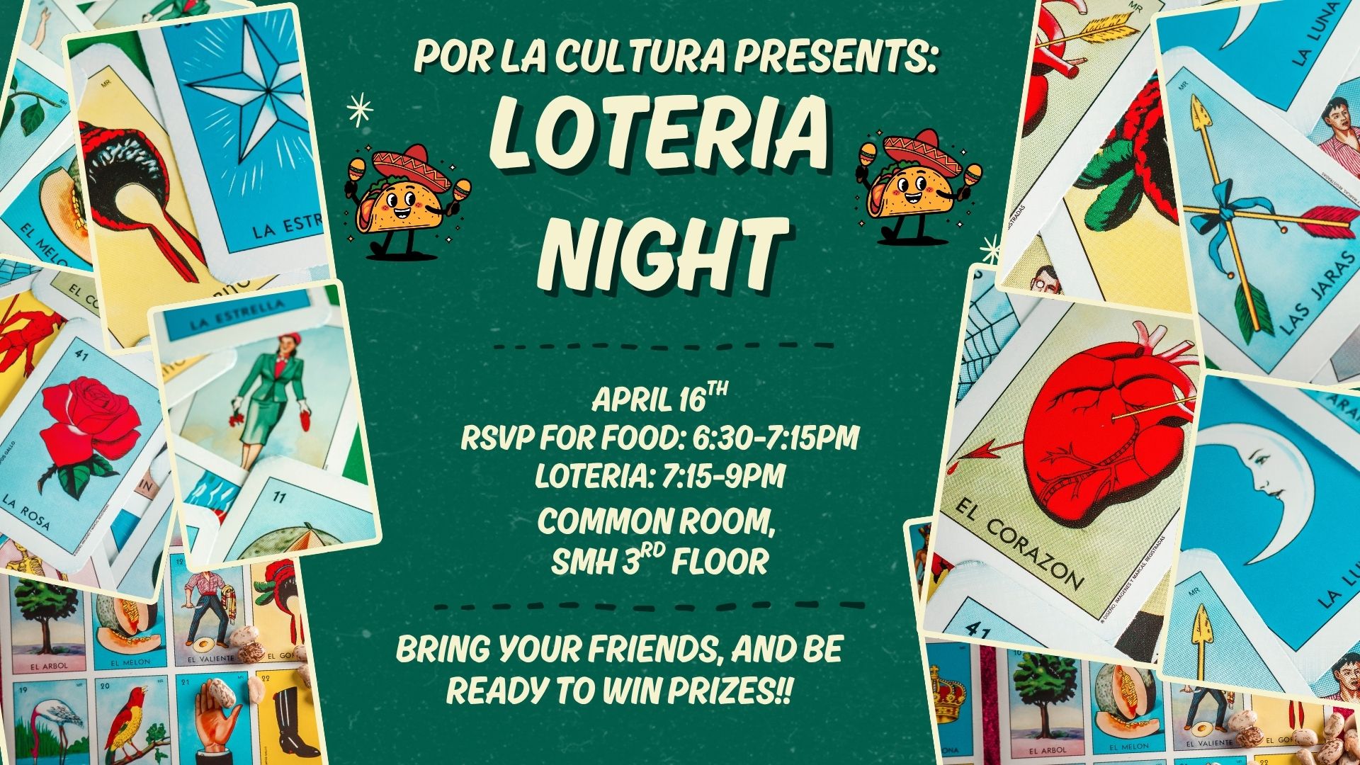 Por La Cultura invites you to join us for our final event of the semester Lotería Night! Come celebrate, connect, and enjoy a fun evening with our community.