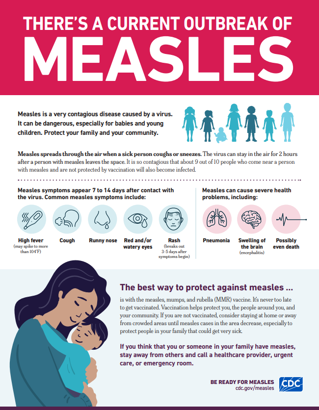 There are currently measles outbreaks throughout the country, with cases in Minnesota and Wisconsin, as well as outbreaks in many southern states. There are not any currently in our area, however we are proactively spreading information on what to look for. Please be aware of the symptoms and steps to take if someone becomes ill or if you have a known exposure, especially if traveling for spring break.