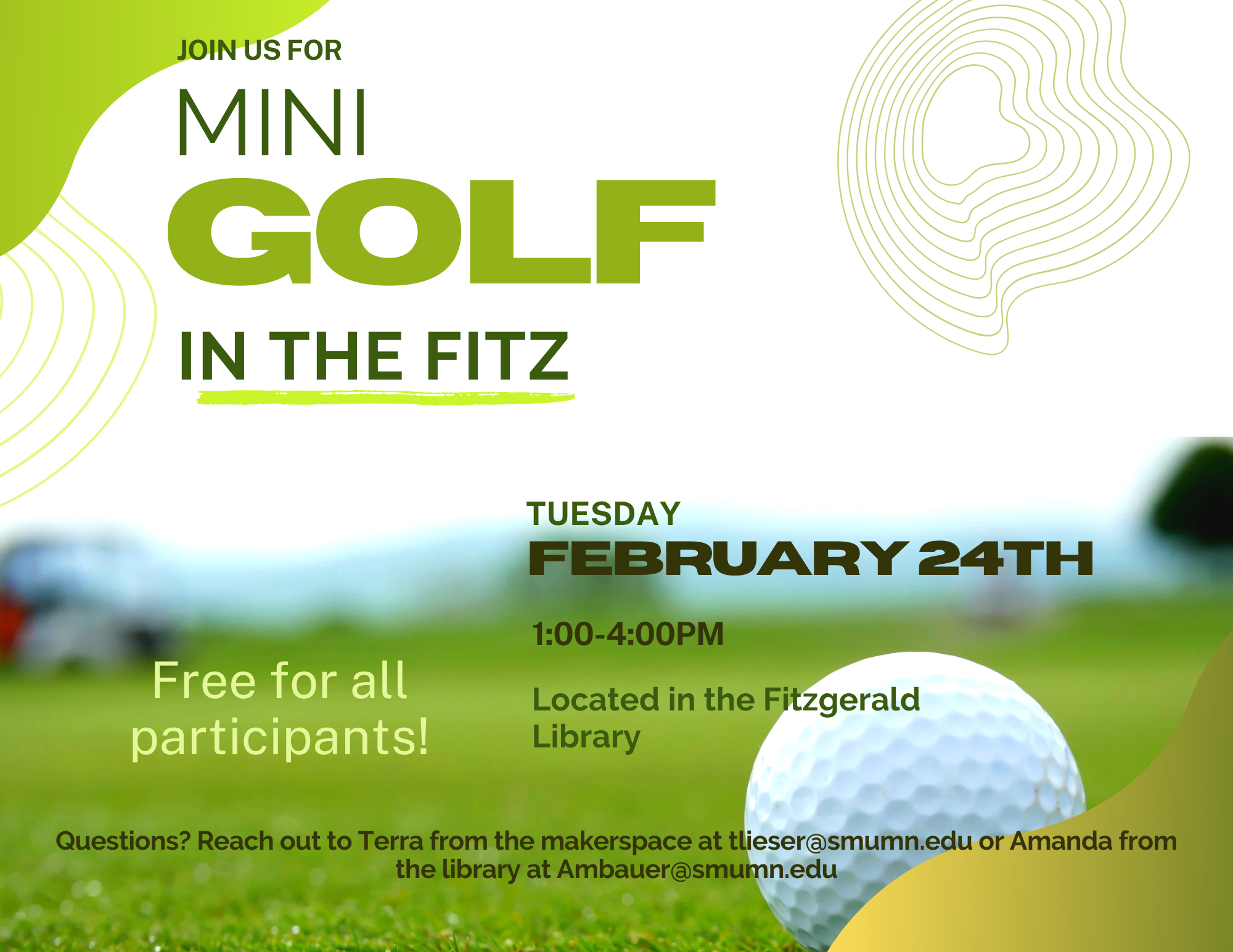 Join us in the library to play mini golf! Bring your friends and enjoy a little friendly competition on the 3-hole course. We would love to see you there! Stop by anytime between the hours of 1pm and 4pm.
