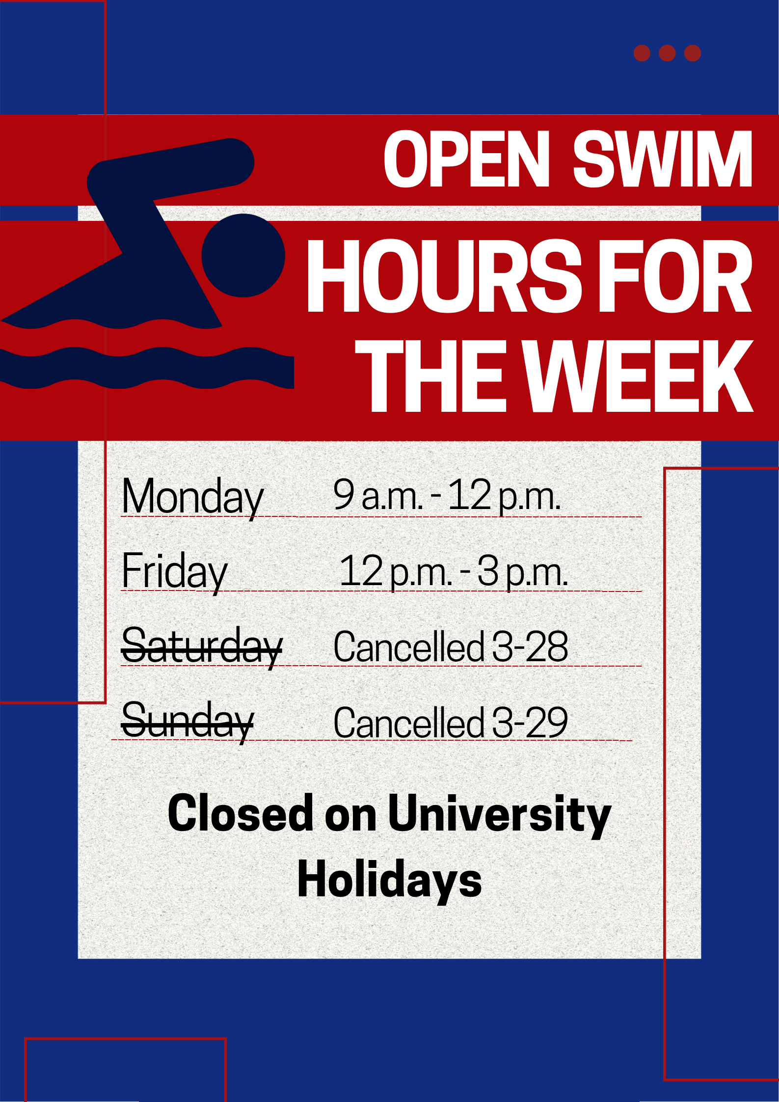 Open Swim will be cancelled for this upcoming weekend on Saturday, March 28th, and Sunday, March 29th.