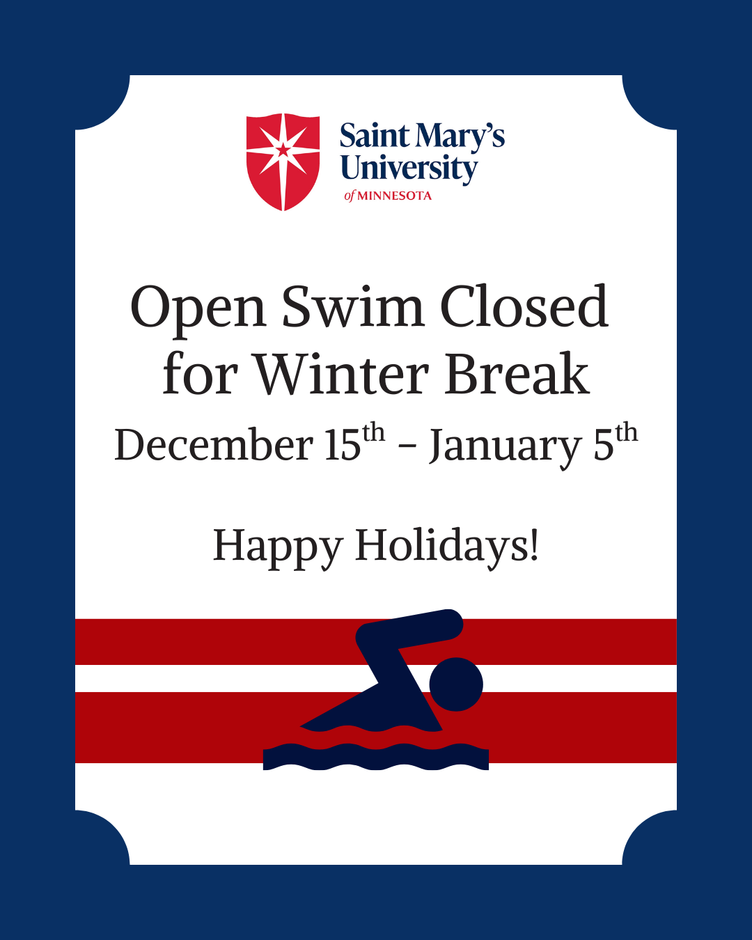 Open swim will be closed during Winter break. It will reopen the week of January 5th with new hours that will be posted within the next few weeks. Please reach out with any questions regarding the pool to eventserivces@smumn.edu. Have an amazing break and happy holidays!