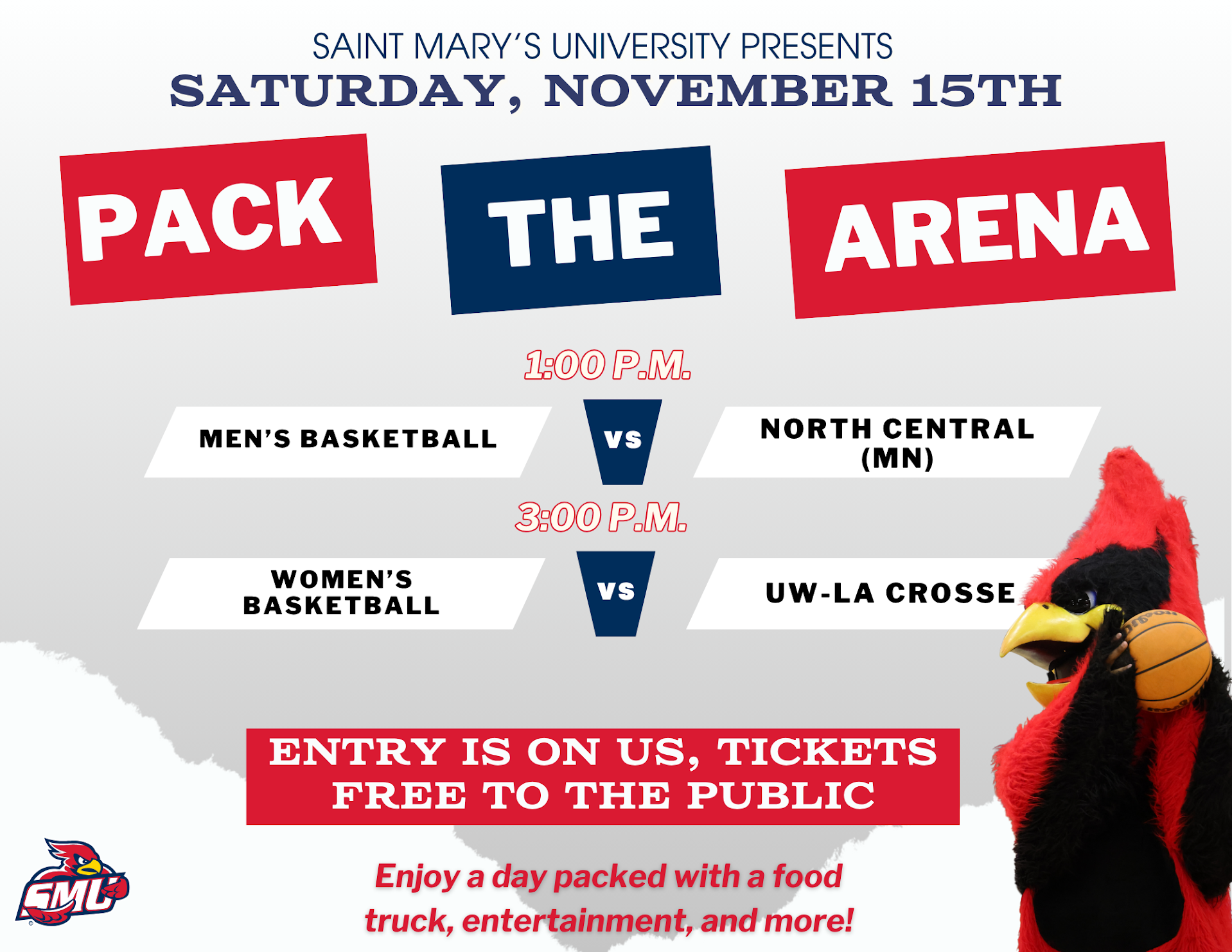 Let’s pack the David R. Thies Arena for a special Homecoming Saturday for our basketball doubleheader. Bring all your friends and family as we welcome everyone to free admission. The Cardinal men’s basketball team is to host North Central (MN) for a 1:00 p.m. game with special halftime performances and the women’s basketball team is hosting No.15-ranked UW-La Crosse at 3:00 p.m. to close out the festive day.