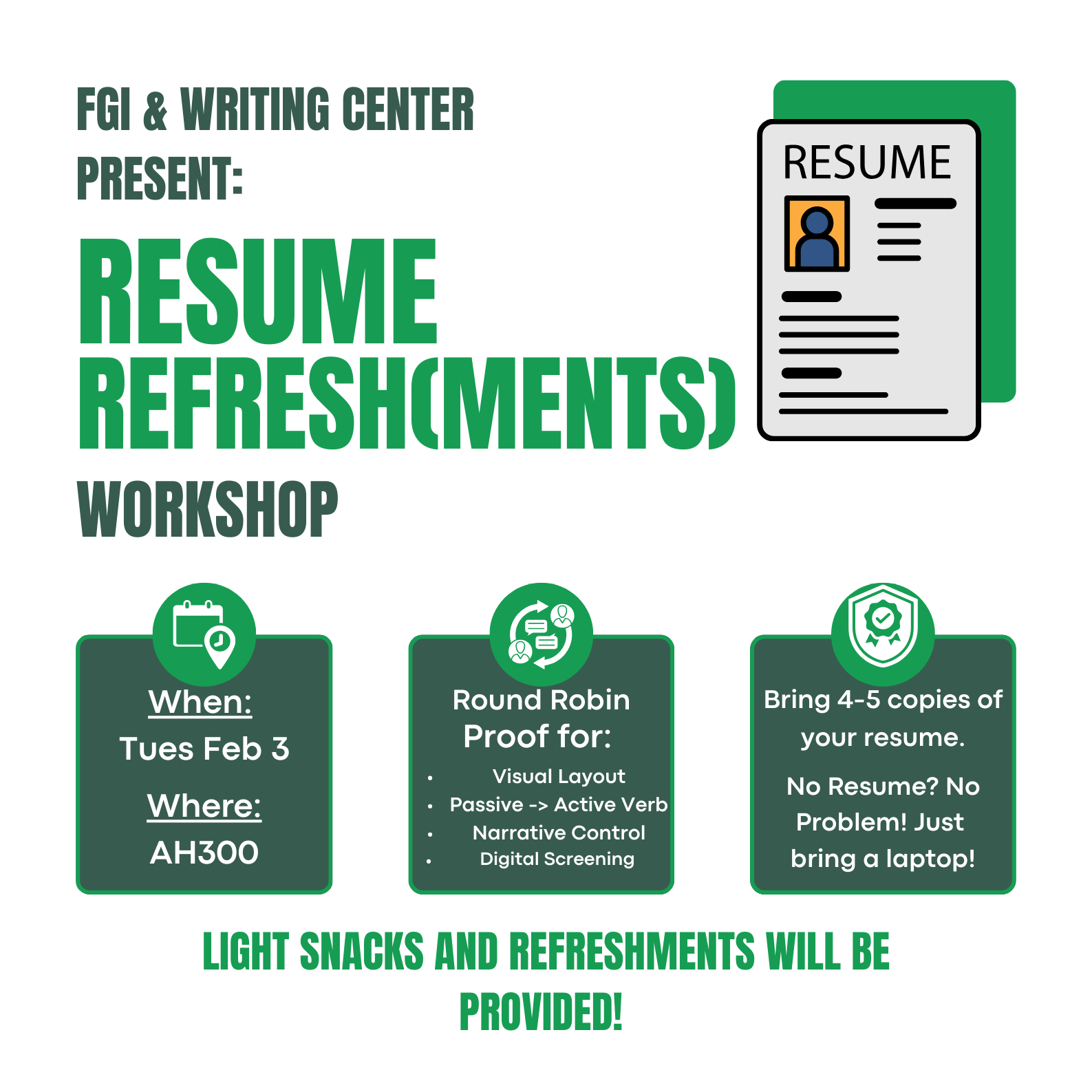 Attendees are encouraged to bring 4 to 5 physical copies of their current resume for immediate feedback. For those without resumes, bring a laptop or mobile device to work with the Writing Center on getting started and identifying experiences and accolades that should be on there!
