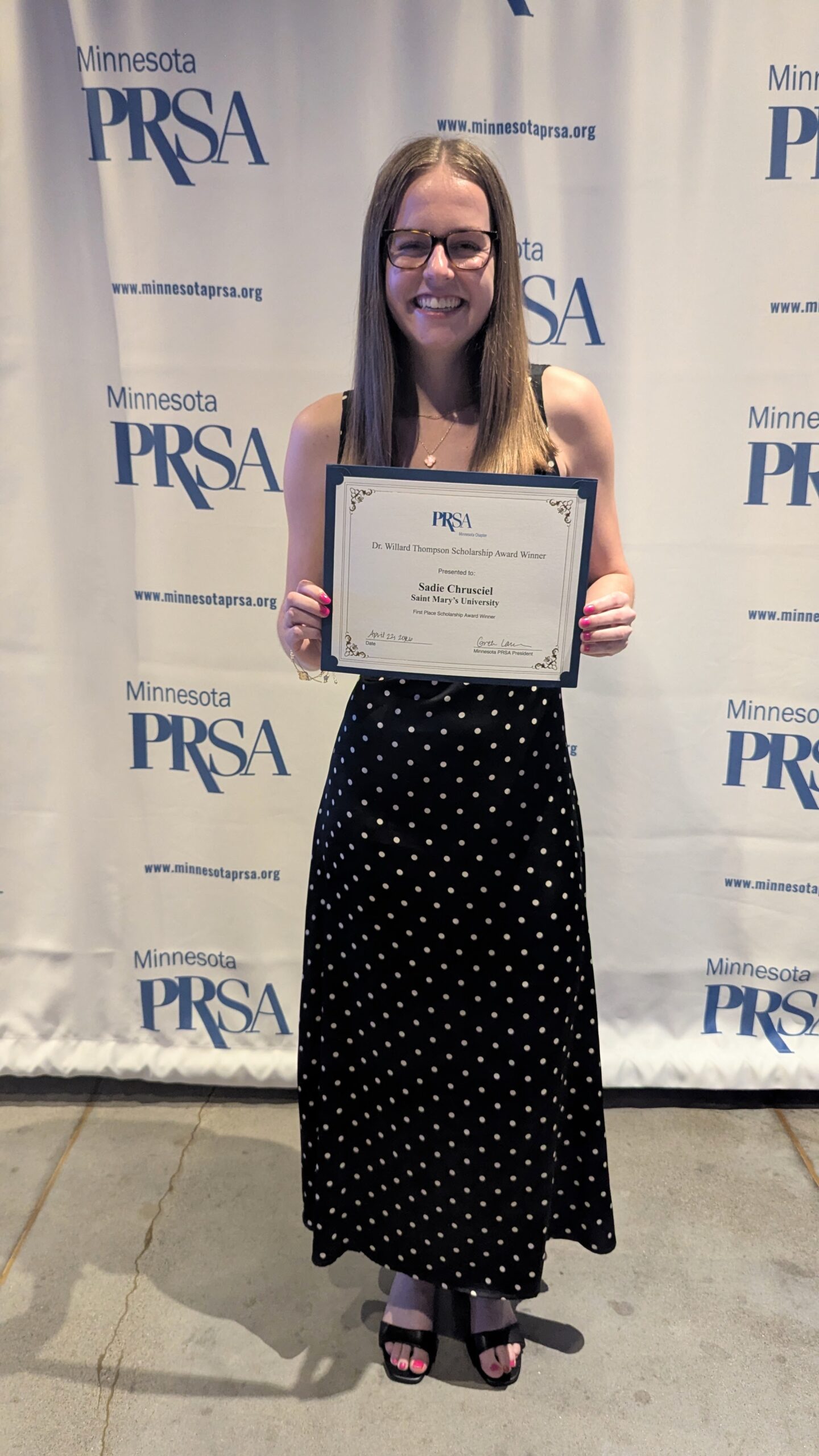 Saint Mary’s Junior Sadie Chrusciel was awarded the highest scholarship honor from the Public Relations Society of America Minnesota Chapter . Chrusciel won the first place scholarship, $2,000, in the Dr. Willard Thompson Scholarship Award competition. A panel of Accredited Public Relations (APR) professionals judged the student entries, which consisted of a work sample and an essay about the importance of public relations in today’s society. The award recipients were announced at the Minnesota PRSA Classics Award Ceremony on Thursday, April 22 at CHS Field’s Securian Financial Club in St. Paul. Chrusciel is a double major in Public Relations and Digital Media and Sport Management. She is also on the varsity women’s soccer team.