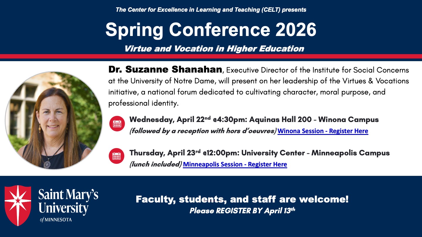 Wednesday, April 22nd @4:30pm: Aquinas Hall 200 – Winona Campus (followed by a reception with hors d’oeuvres) Winona Session – Register Here