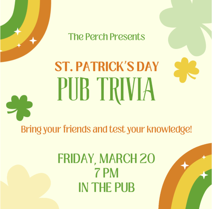 Celebrate St. Patrick’s season with Pub Trivia on Friday, March 20, at 7 PM in the pub! Gather your friends, and put your knowledge to the test with a fun mix of trivia categories. Whether you’re a trivia whiz or just in it for the fun, it’s the perfect way to keep the St. Patrick’s spirit going… and win a prize! Arrive early, grab a table, and get ready for a lucky night of trivia!