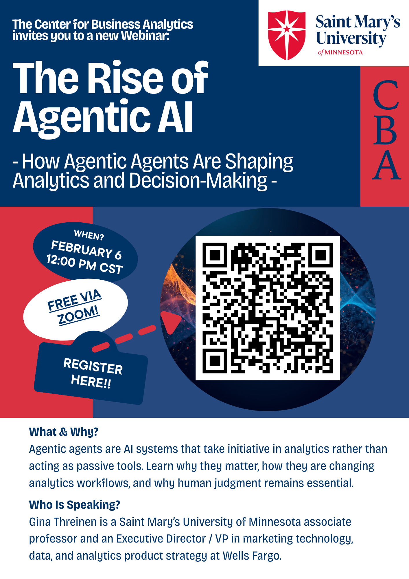 In this session, Gina Threinen, SMUMN’s associate professor and Executive Director/VP at Wells Fargo, explores the rise of agentic AI from a conceptual and industry-wide perspective. Drawing on her industry leadership and graduate education experience, Gina examines how agentic agents are influencing modern analytics workflows and how they are redefining the relationship between AI-generated insights and human judgment.