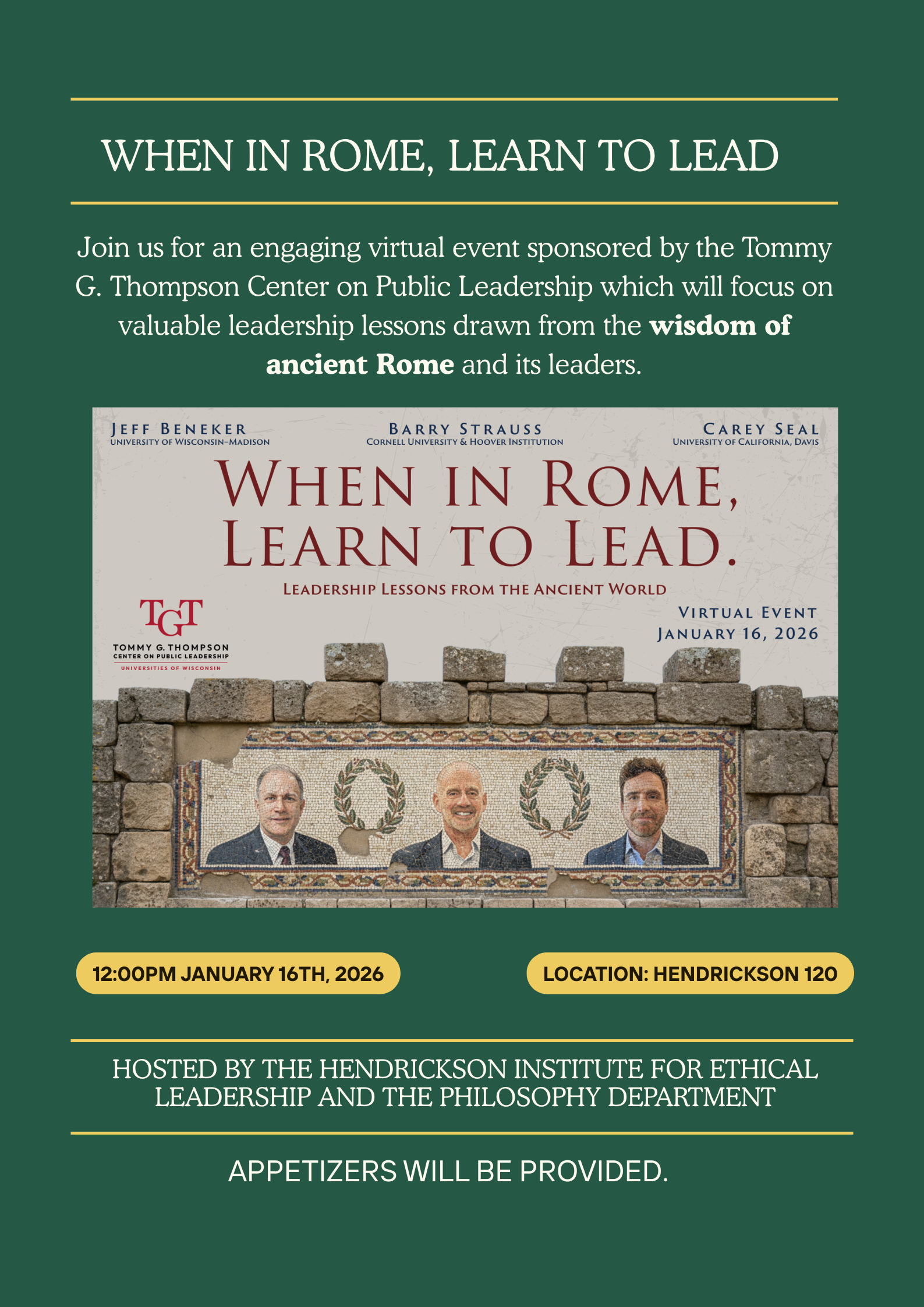 Please join us in Hendrickson 120 at 12pm on Friday, January 16th for this virtual event sponsored by the Tommy G. Thompson Center on Public Leadership. This virtual conversation will deal with leadership lessons from the ancient world and will feature Jeff Beneker, Barry Strauss, and Carey Seal. Refreshments will be served.