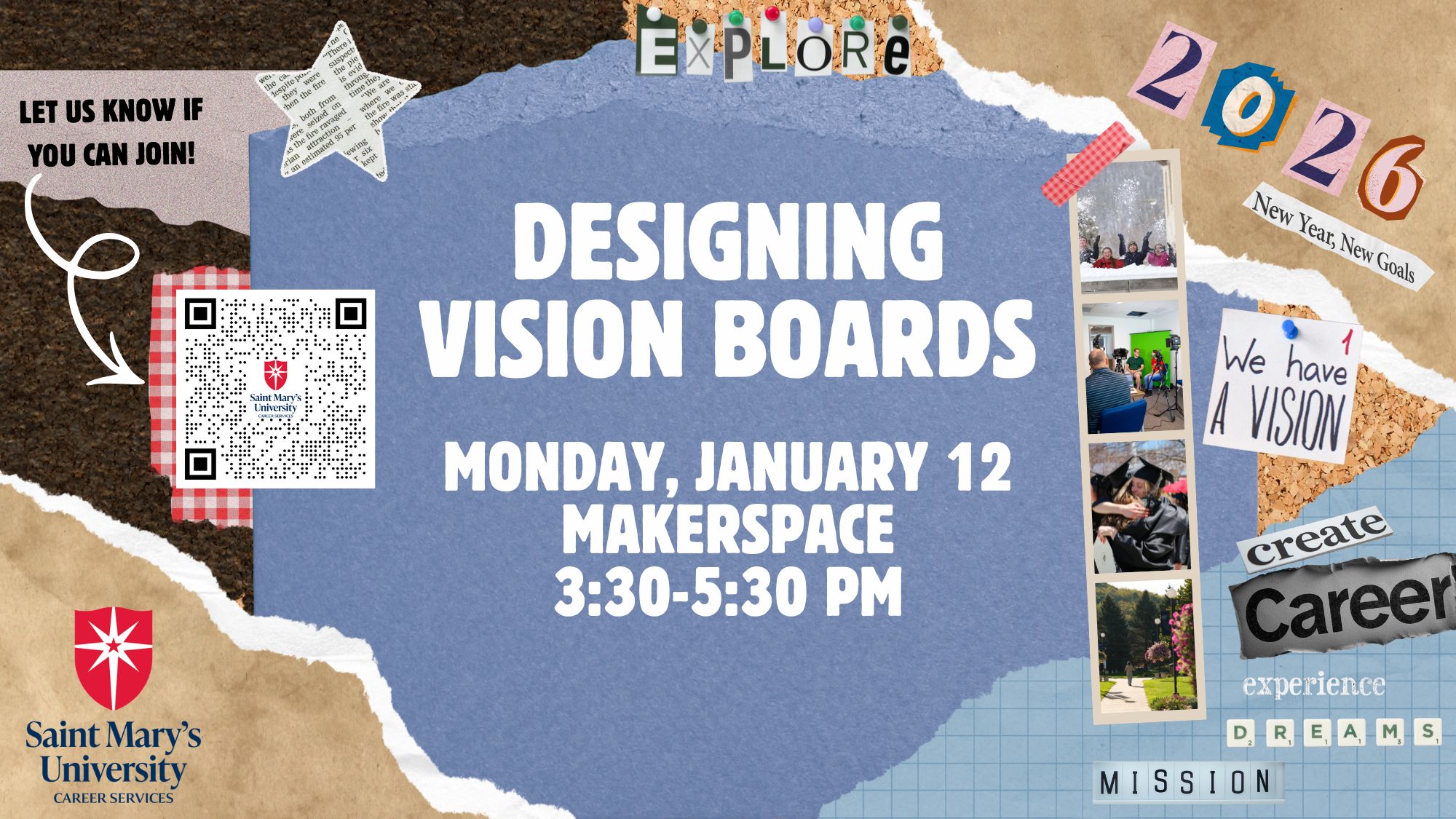 Stop by the Makerspace from 3:30–5:30 pm to design a vision board—physical or digital—and map out your goals for the year ahead.