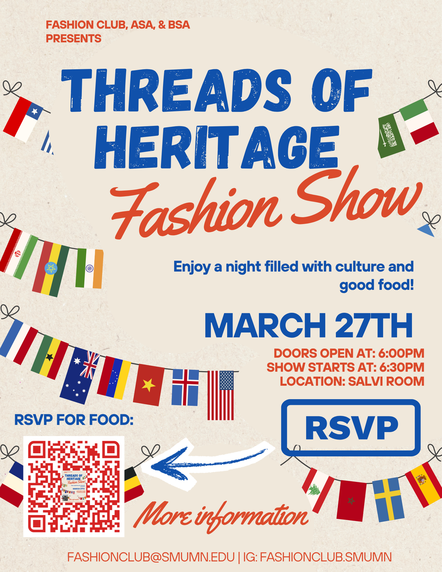 RSVP: Threads of Heritage Fashion Show on March 27—celebrating global culture, fashion, and food. Scan the QR code to RSVP and secure your plate!